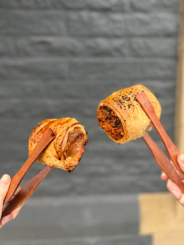 Buttery Wildfarmed puff pastry roll filled with Moss Valley sausage & Marms onion marmalade